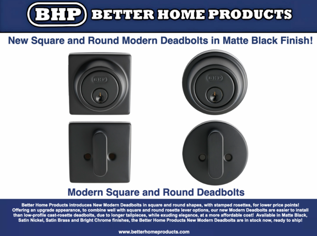 Better Home Products introduces New Modern Deadbolts in square and round shapes, with stamped rosettes, for lower price points!