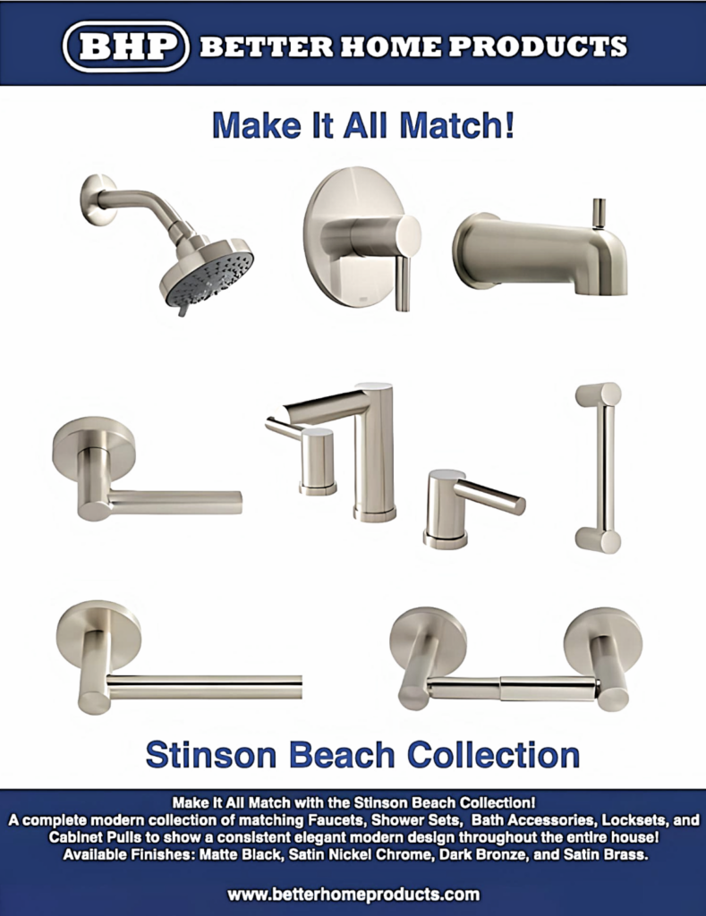 A complete modern collection of matching Faucets, Shower Sets, Bath Accessories, Locksets, and Cabinet Pulls to show a consistent elegant modern design throughout the entire house!